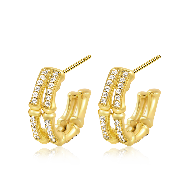 This pair of Double Bamboo Hoop Earrings is made of sterling silver plated with 18K gold, and is inlaid with a number of white gems, very shining. This is the most popular element this season. It can be worn daily and suitable for any occasion.