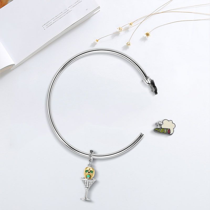 A green color tone charm ends removable open bangle bracelet. You may unscrew one side of the end and put your favorite charms on.