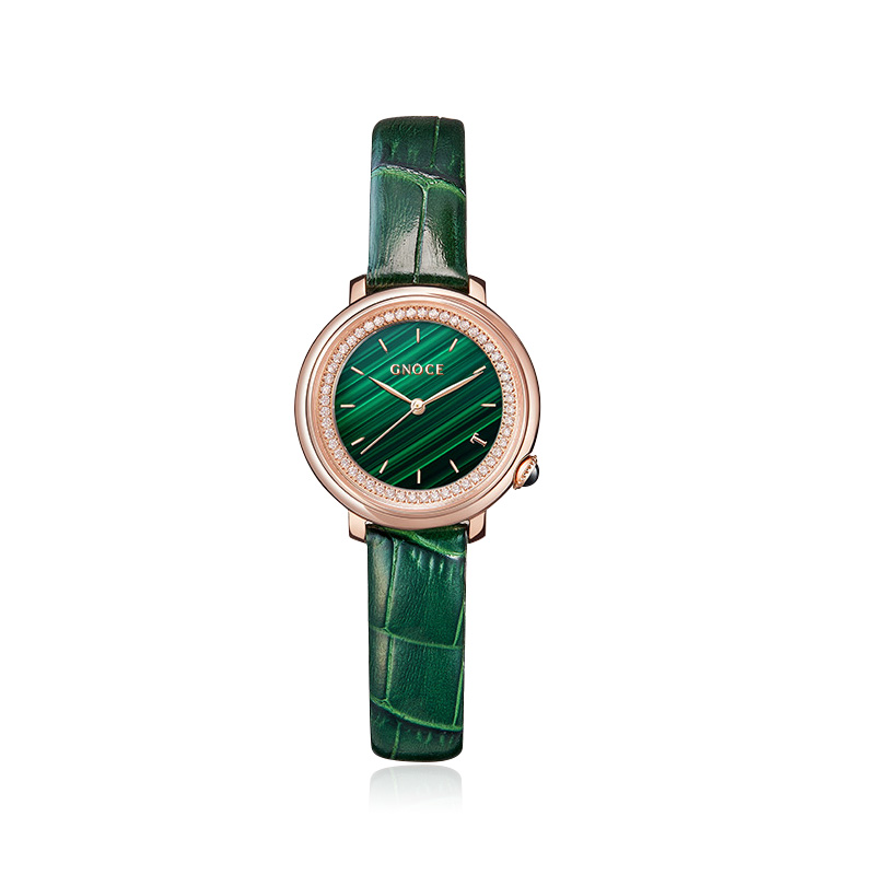 Malachite dial Surrounded by crystal zircons, hardened mineral glass cover, black agate crown, cowhide strap, and quartz movement. Elegant and beautiful.